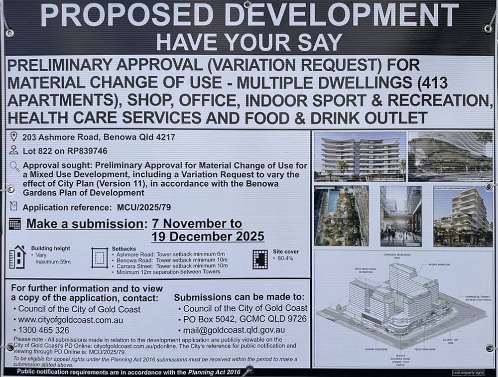 “Benowa Gardens Shopping Centre is facing a drastic transformation into a high-density mega precinct, featuring three 59m high residential towers with up to 1350 bedrooms, a hotel, commercial office spaces, and a retail space buried beneath. This scale of development is to maximise developer profits and cause chaos for the community.”